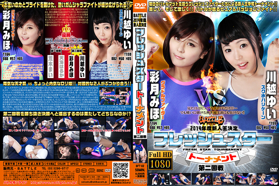 BATTLE2014年度新人王座決定 フレッシュスタートーナメント 第二回戦 BATTLE 2014 Rookie of the Year Championship Fresh Start Tournament Round 2  メーカー バトル 公開日 2014年9月1日 品番/内容 BFT-02 / 50分 陽気な天才肌 vs ちょっと内気なロリ娘!! 対照的な2人がぶつかり合う!! B-1、エクストリーム、2つのトーナメント戦が終わった。そして3冠タイトルマッチの末に絶対的王者の中居ちはるが破れ去り、一つの時代が終わりを遂げた。そして新しいBATTLEの明日を担う新人スターの誕生が望まれる中で、新人王トートナメントが開幕した。エントリーされたのは4人の新人フレッシュファイター達である。第一試合には”天海はるか”と”荒木まい”の2人が対決。彼女たちは優しそうな見た目からは想像できない、激しいパッションファイトを繰り広げた。そして第二試合にエントリーされたのは”彩月みほ”と”川越ゆい”の2人。グラビアでも活躍しセクシーなコスチュームをも大胆な着こなす陽気な天才レスラーの彩月みほ。それに対して、大人しくてちょっぴり内気だけど、でも戦いに賭ける熱意は誰に負けない自信がある川越ゆい。対照的な2人だが、リングの上に立てば目標は同じ、新人王の座を掴むために相手を倒すのみである。新人だけど甘えなんて無い!クラシカルな技を中心としながらも、相手の関節技にかかるまいと激しく抵抗し、攻防が激しく入れ替わるスリリングな試合展開は、目を離す暇を与えないであろう。時にはピュアハート・正々堂々と、時には熱く激しい打撃でのぶつかり合い、そして時には苦痛に耐えられす女の子らしく泣き叫んでしまう!? BATTLEが送る、新人王座争奪フレッシュスタートーナメント、お見逃しなく!!